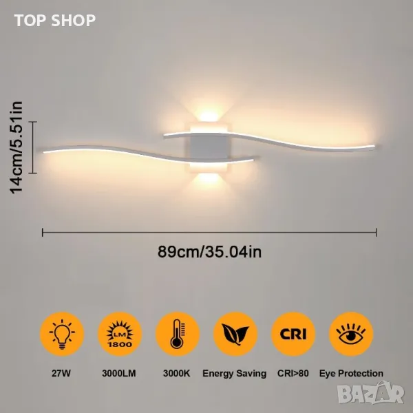 LED стенната лампа се отличава с креативен вълнообразен дизайн, предлагащ модерен минималистичен стил с мека, околна светлина, която осветява както нагоре, така и надолу, подобрявайки декора на помещението и създавайки уютна атмосфера. С размери 5,5 x 14 x 89 cm, той консумира 27 W и излъчва 3000 лумена топла бяла светлина при 3000 K с напрежение 220 V. Изработен от висококачествена алуминиева сплав с пясъкоструйно покритие, той е антикорозионен и устойчив на ръжда, съчетан със стабилен акрилен PVC абажур, който осигурява равномерна пропускливост на светлината. Подходяща за различни вътрешни пространства като всекидневни, спални, коридори, кухни, стълбища, хотели и барове, тази издръжлива стенна лампа е лесна за инсталиране с включени аксесоари за монтаж и може да се позиционира вертикално или хоризонтално.