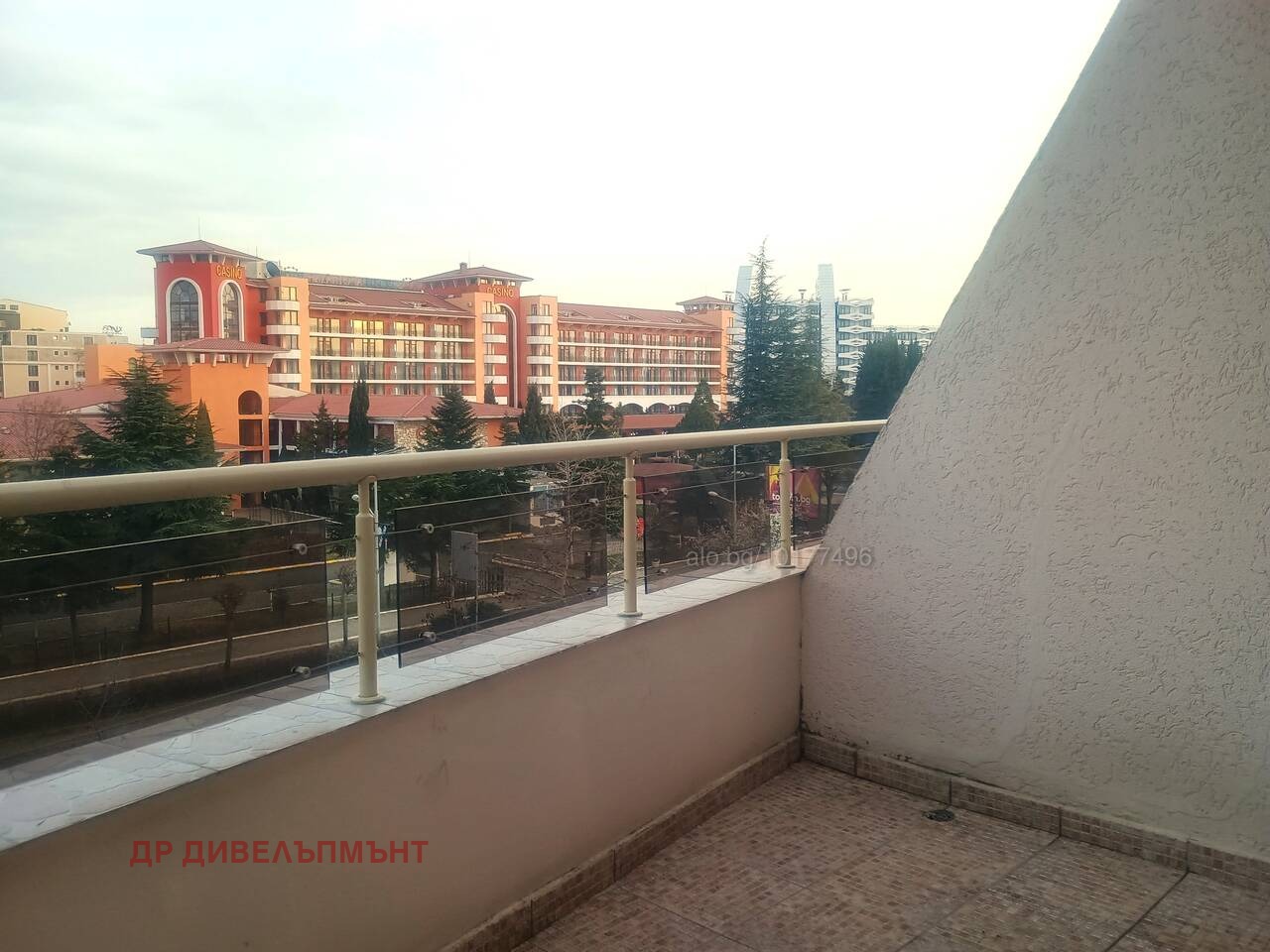 студио с панорамна тераса до Автогарата и централната част на Слънчев бряг - главната на Слънчев Бряг, с голям басейн и паркомясто. Сградата е емблематична за района.