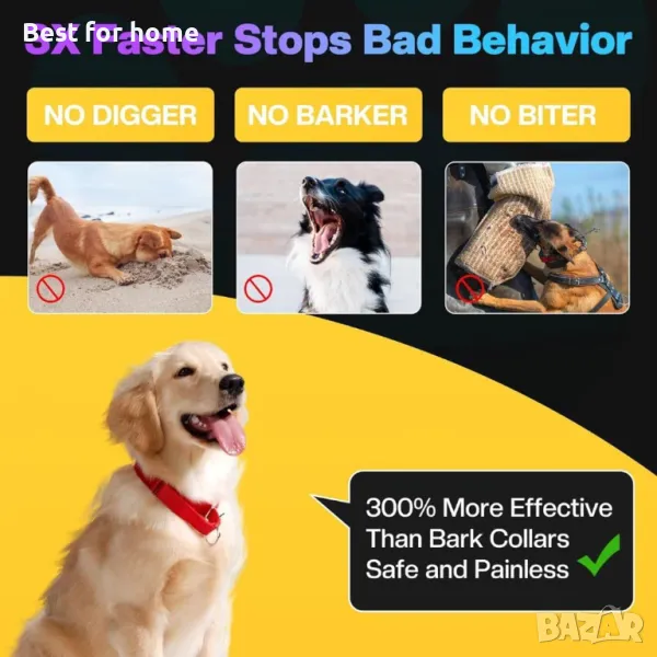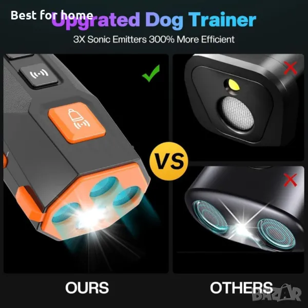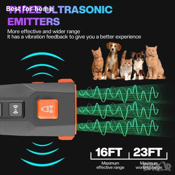 вангардна ултразвукова технология: Оборудвано с три усъвършенствани ултразвукови излъчвателя, това устройство против лай ефективно спира лаещите кучета, осигурявайки спокойна вътрешна и външна среда. Перфектен за обучение на домашни любимци и корекция на поведението.