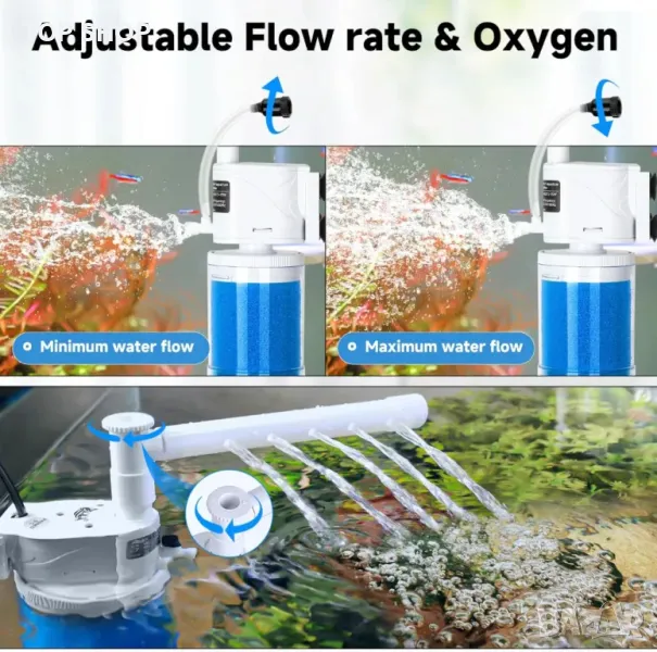 Този аквариумен филтър "всичко в едно" предлага ефективно абсорбиране на примесите, създавайки чиста и свежа среда за водните обитатели. Разполага с два режима: режим на аериране с регулируем въздушен поток за увеличаване на подаването на кислород и режим на дъжд за нежно разпределение на водата. Регулируем клапан за потока осигурява комфортна среда за малки риби и скариди. Ултра-тихият мотор и дизайнът на вътрешната помпа минимизират шума, докато големият филтърен патрон позволява персонализирано филтриране. Подходящ както за солена, така и за сладка вода, той е лесен за използване, почиства се и е идеален за различни аквариуми и хидропонни съоръжения.