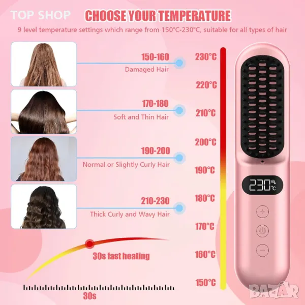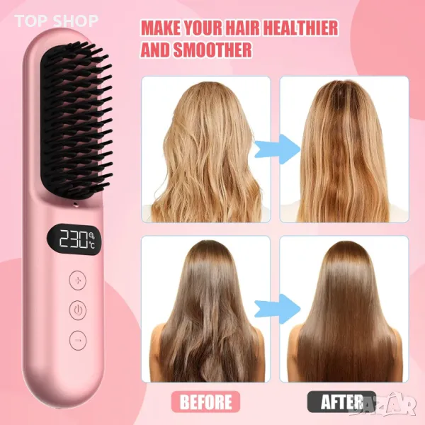 Тази усъвършенствана йонна четка за изправяне на коса използва силата на йонната технология за постигане на копринено гладка, здрава коса чрез намаляване на къдренето, статичното електричество, разцепените краища и възелите. Неговият MCH нагревател осигурява 30 секунди бързо нагряване, което го прави с 20% по-ефективен и идеален за бързо оформяне. С регулируеми температурни настройки, вариращи от 150°C до 230°C и йонни керамични косми, той се адаптира към всички типове и дължини на косата, осигурявайки нежно оформяне. Независимо дали имате фина, гъста, къдрава или права коса, тази четка за изправяне осигурява персонализирани настройки за топлина за постигане на лесна, зашеметяваща коса. Проектиран за лесна употреба и удобство, той разполага с дизайн с двойна батерия, порт за зареждане Type-C за предотвратяване на заплитане на кабели и значителен капацитет на батерията от 5000 mAh*2, което го прави удобен за пътуване за стилизиране в движение.