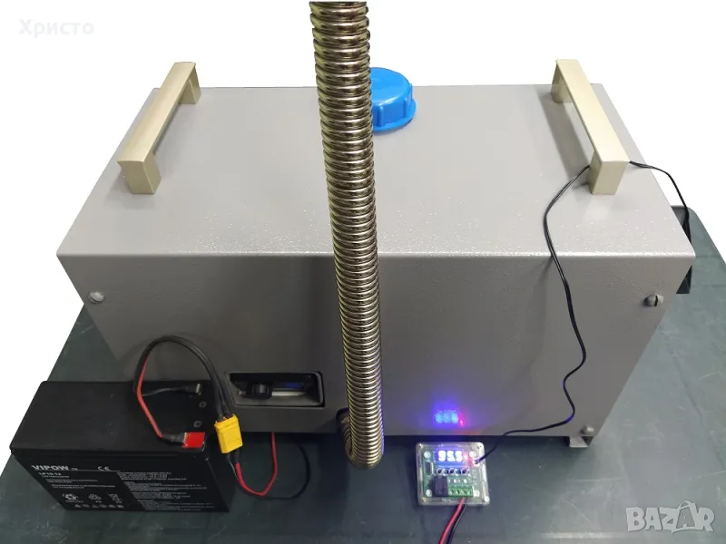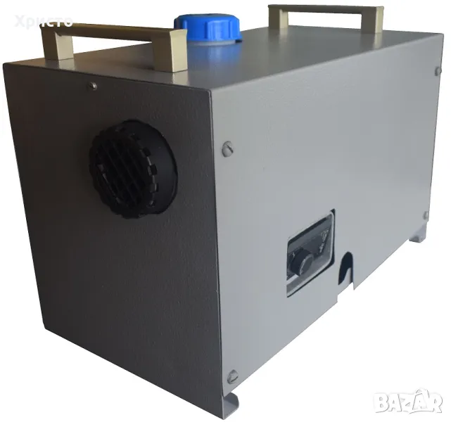 200гр/ч /300гр/ч/. Кожуха е изработен от метал. Може да работи с външен акумулатор или със захранване от автомобила.Температурата на отопление и мощността се регулира. Настройка на посоката на духане на топлия въздух.Топлия въздух излиза от печката с температура над 95 градуса. Тегло 8,5кг за печка 2KW/теглото може да варира в зависимост от окомплектацията на печката/Размери:40смХ25смХ22см /за 2кв/ 41смХ42смХ26см /за 5кв/