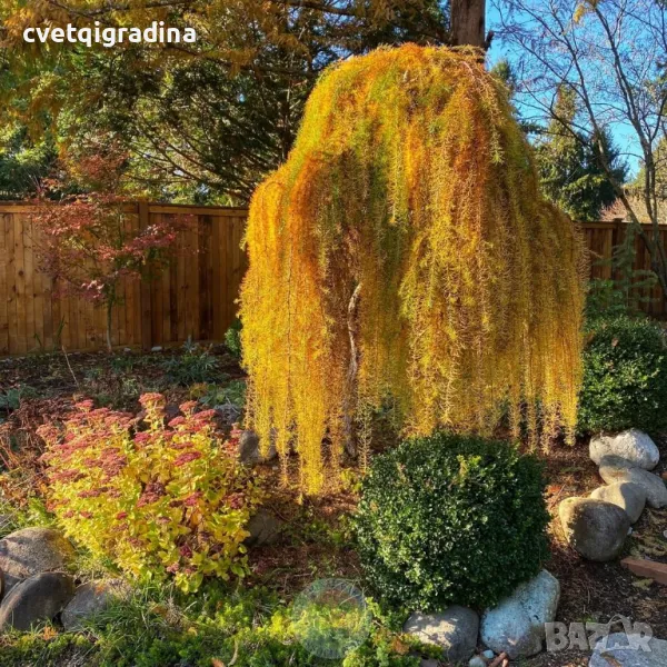 Larix decidua pendula(Ларикс пендула)Докато larix имат вид на вечнозелени растения, те отделят иглите си всяка есен.Това е едно от малкото широколистни дървета,които можеш да объркаш с иглолостно,вечнозелено. Блестящото шоу от златисто-жълти игли го прави визуално впечатляващ през есенните месеци. Изключителен екземпляр сред големи скали или близо до водни обекти.