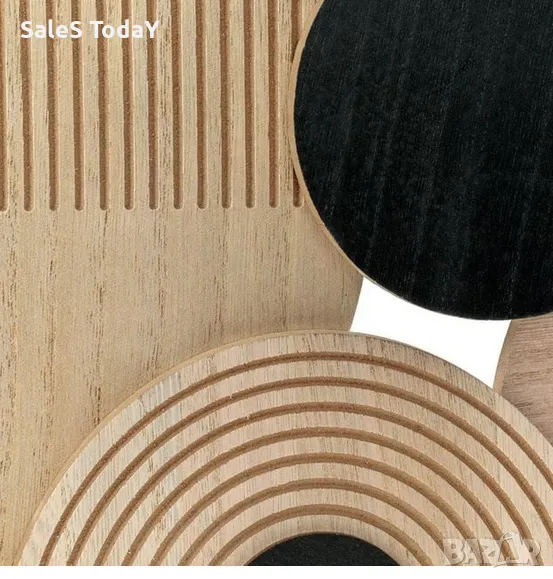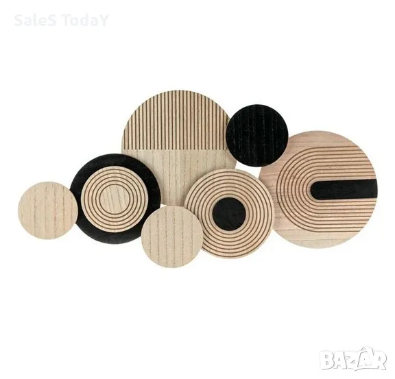 Декорация за стена с дървени дискове в различни размери, в естествен и черен цвят с релефен дизайн. Монтира се с 2 метални опори от задната страна. Пасва както на цветни, така и на бели стени и придава модерна нотка на вашата декорация. Материал на продукта дърво Дължина x Ширина x Височина 67,5x34x2,5см