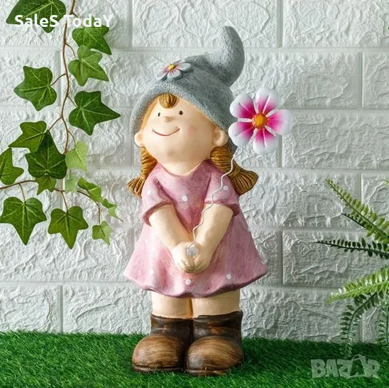Декоративно керамично градинско момиче с плитки, розова рокля на точки, сива шапка с цвете и метално бяло/фуксия цвете в ръцете.