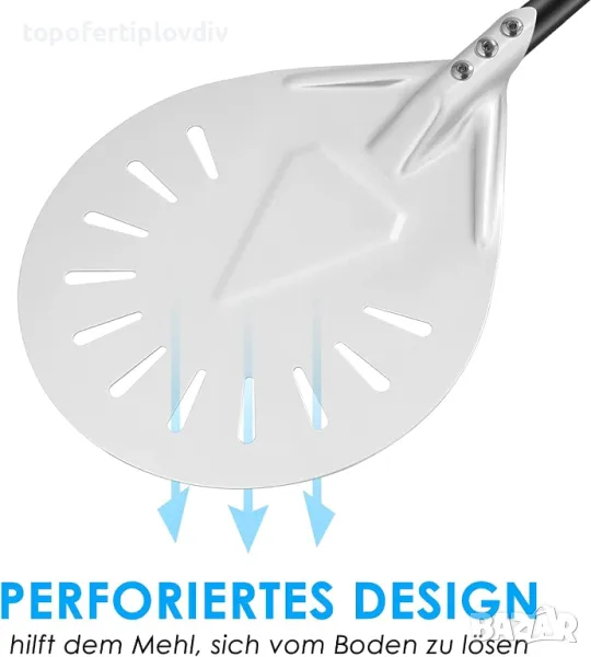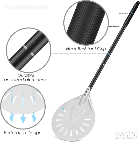 лопата за пица: перфорирана лопата за пица с дълга дръжка е изработена от лек и издръжлив, висококачествен твърд анодиран алуминий, висококачественият алуминий е устойчив на ръжда, корозия и надраскване, устойчив на високи температури, но също така устойчив на износване.