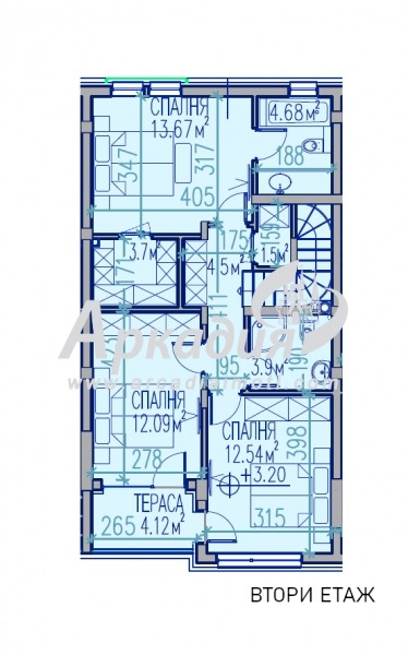 ВТОРО НИВО: ТРИ спални към едната има собствен санитарен възел, втори санитарен възел и обща тераса за двете спални.