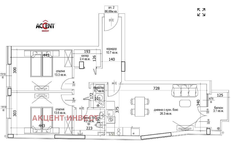 На площ от 99кв.м са разположени: входно антре коридор-10,7кв.м, слънчева и просторна дневна с кухненска част-26,3 кв.м, спалня-13,3кв.м, втора спалня-13,3кв.м баня с тоалет- 4,2кв.м., килер-2.4кв.м., перално- 1,7кв.м. и тераса- 3,1кв.м.
