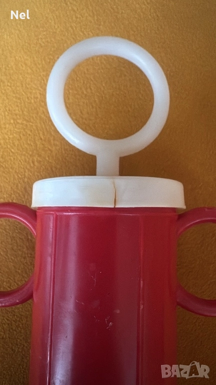Пластмасов шприц от соца с 5 накрайника. Ползван веднъж някога…Има лека забележка, но мисля, че не пречи на ползването (последната снимка)