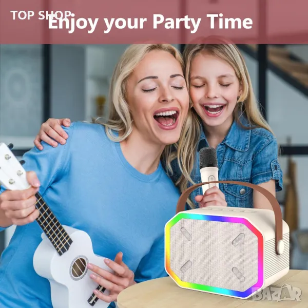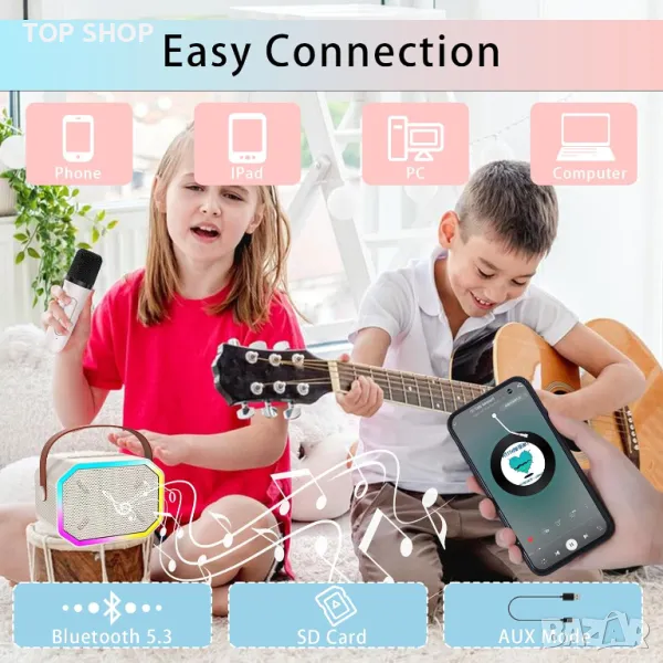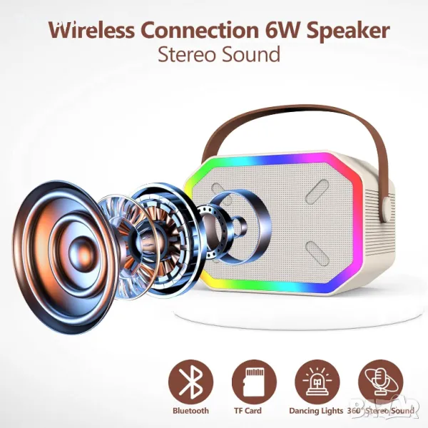 Комплектите преносими Bluetooth караоке машини предлагат компактен дизайн от две части, включващ Bluetooth високоговорители и безжичен микрофон, което позволява независимо използване на високоговорителя като многофункционално устройство. Съвместим с Android, iOS смартфони, компютри, лаптопи и музикални приложения чрез Bluetooth 5.0, той осигурява бързи и стабилни връзки до 10 метра. Въпреки своя мини размер (1278,5 cm) и леко тегло (446 g), той осигурява мощен, ясен звук благодарение на високопроизводителен аудио драйвер и усъвършенстван цифров сигнален процесор, идеален за създаване на KTV звукова среда на живо. Безжичният микрофон разполага с усъвършенствано намаляване на шума, DSP аудио процесор за регулиране на високите и басите и забавни опции за промяна на гласа (Оригинален, Бебешки, Женски, Мъжки, Чудовищен) за допълнително забавление. В допълнение, караоке тонколоната е оборудвана с цветни диско светлини с шест режима за подобряване на всяка парти атмосфера. Идеален като уникален подарък за деца и незаменим за семейно забавление, тази машина за караоке превръща всяко пространство в сцена за рождени дни, празници и тържества, насърчавайки забавление и интерактивно пеене.