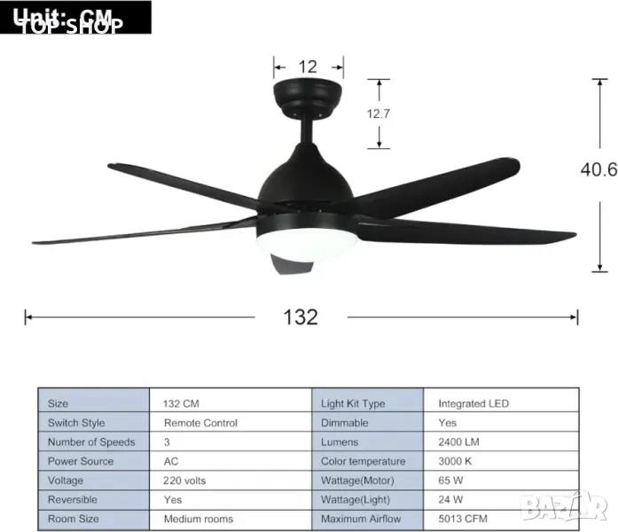 Този вентилатор на тавана е с диаметър 132 CM и височина 40,6 CM, с тегло 7,8 KG. Има тих двигател с нива на шум под 35 dB, проектиран да издържи над 15 години. Мултифункционалното дистанционно позволява контрол на скоростта на вентилатора, времето и осветлението, с памет за последната използвана цветова температура. Вградената 24-ватова LED светлина предлага регулируеми цветови температури от студено бяло до топло бяло. Освен това вентилаторът има реверсивна функция за превключване на посоката на въздушния поток между лятото и зимата, подобрявайки енергийната ефективност.
