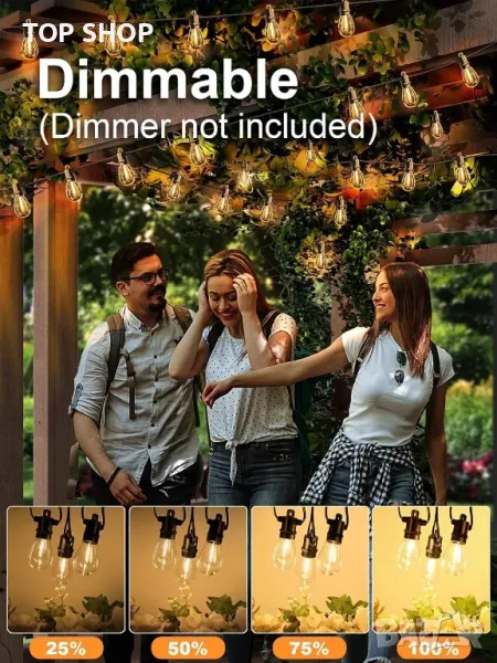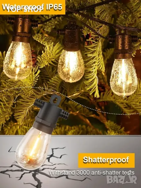 Устойчиви на разбиване LED нишки с 15 гнезда и 16 издръжливи пластмасови крушки (1 резервна) за допълнителна безопасност. Степента на водоустойчивост IP65 гарантира устойчивост на дъжд, сняг, вятър и екстремни температури. Дизайнът с възможност за свързване позволява свързването на множество струни, поддържащи до 432 крушки. Енергийно ефективните 1W LED крушки намаляват разходите за електроенергия с до 98% в сравнение с традиционните опции. Съвместим с димерни превключватели (не са включени) за регулируема осветена среда.