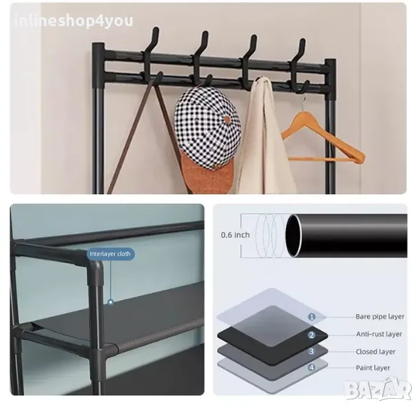 Мултифункционална етажерка, която може да се използва като стойка за обувки, закачалка за дрехи, шапки, обувки, чанти, чадъри и други.