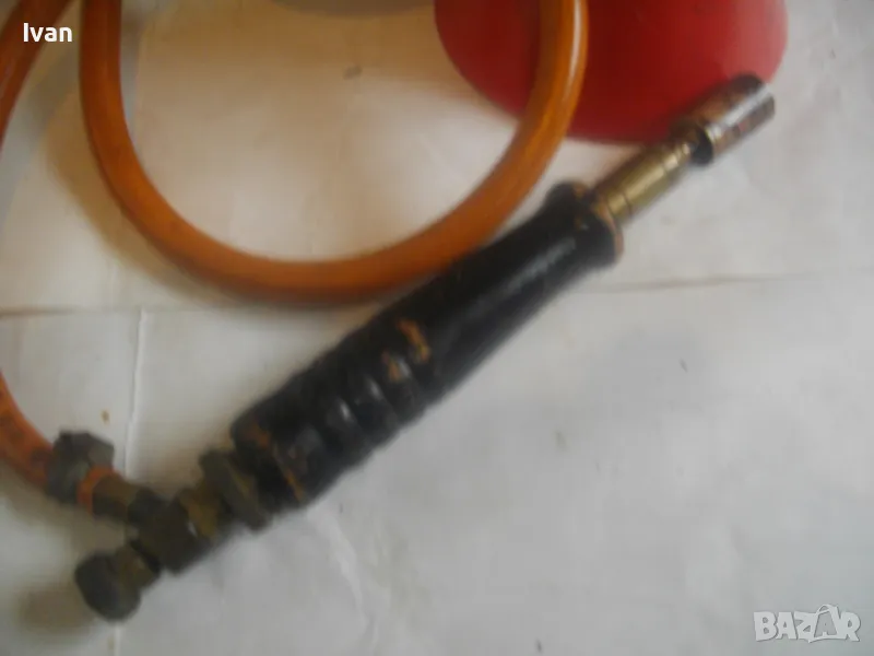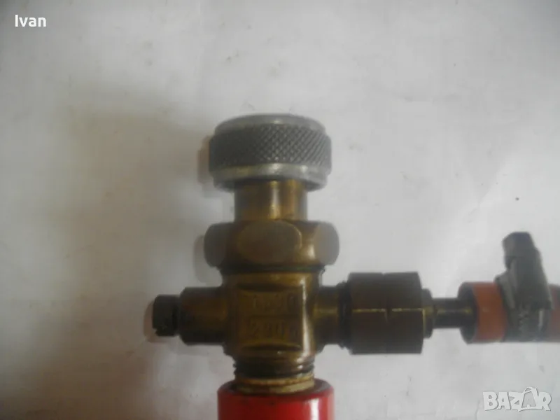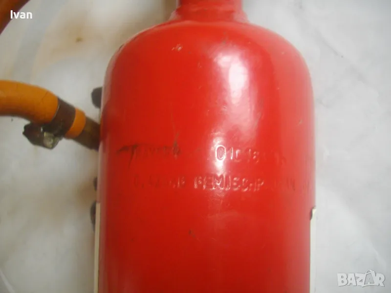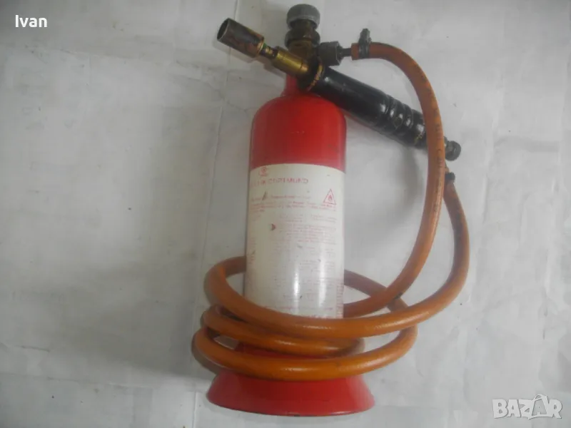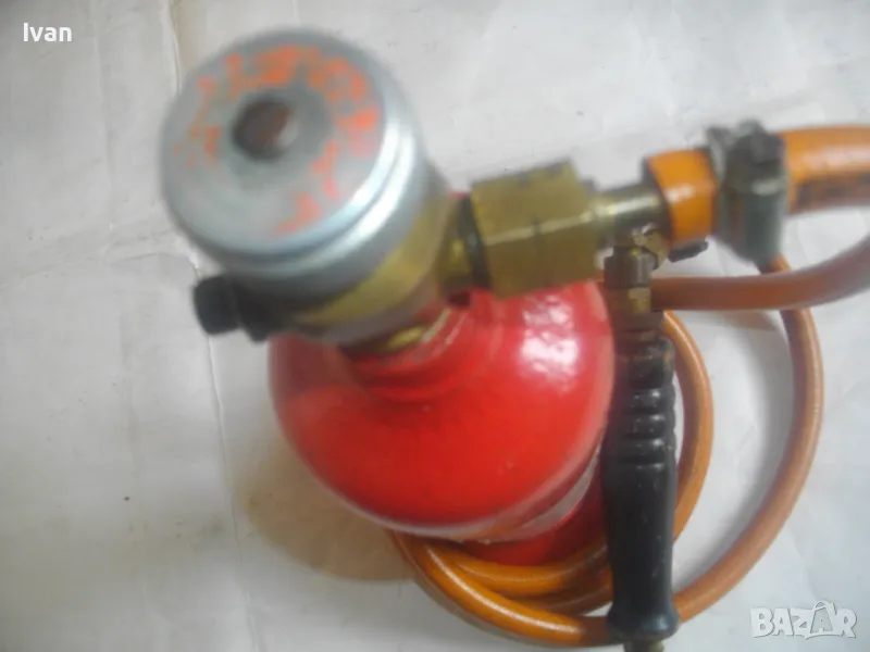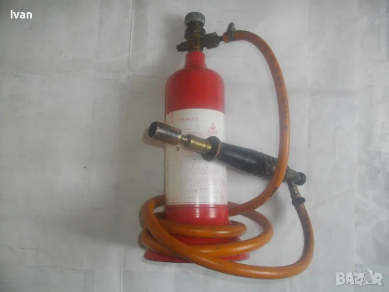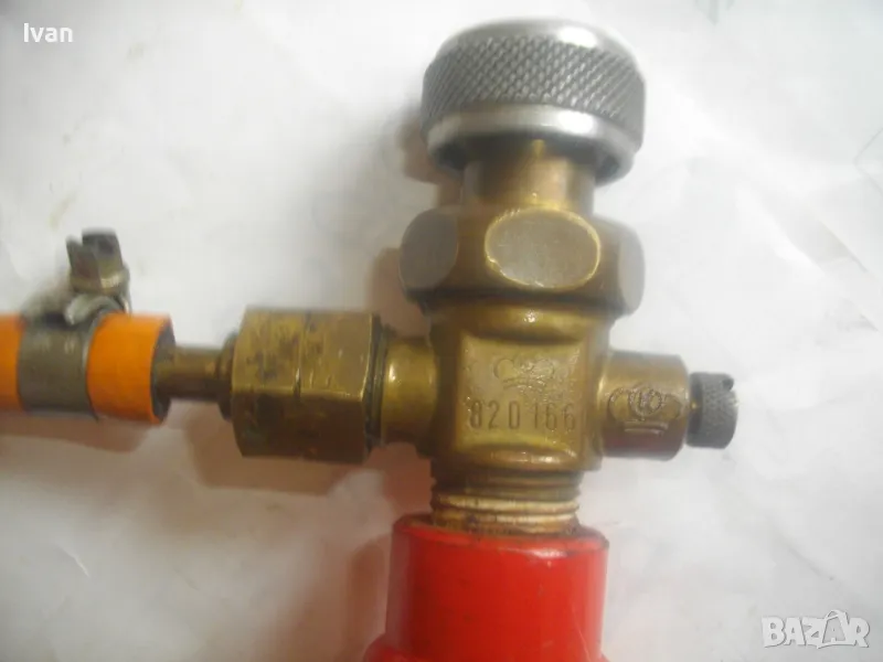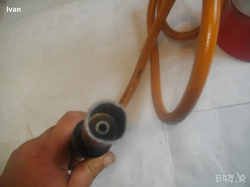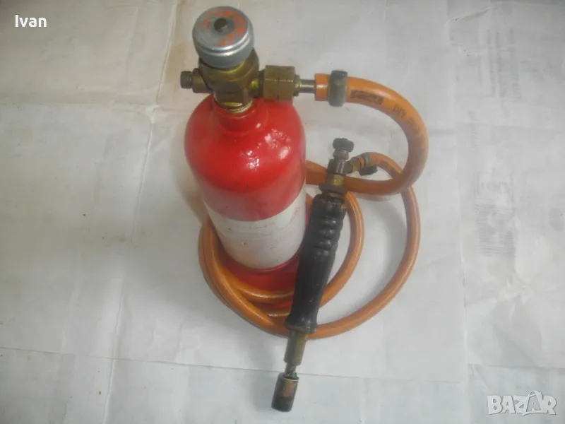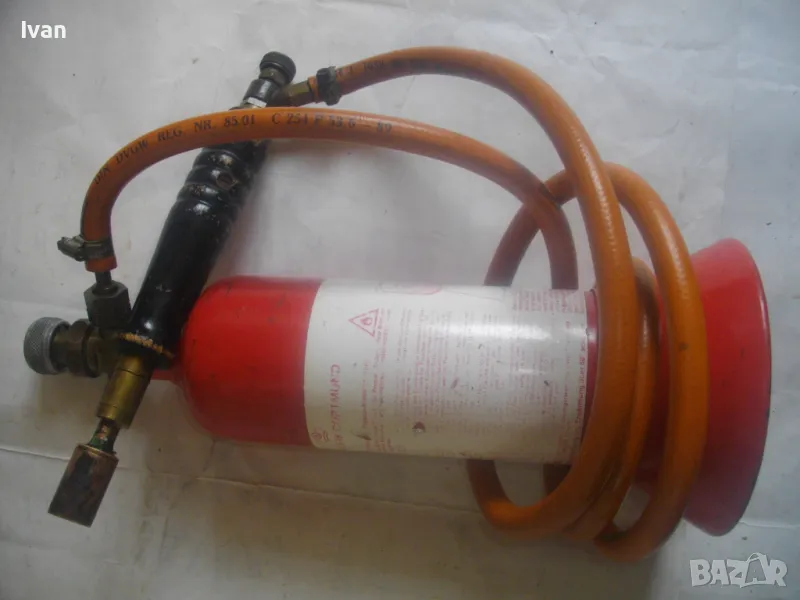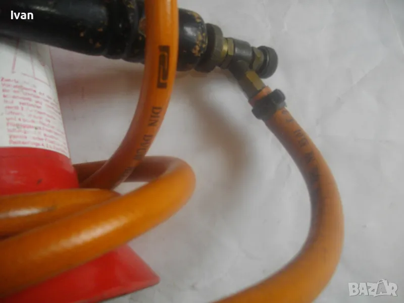 газова горелка за пропан-бутан, скачена с оригинален маркуч и оригиналната си зареждаща се бутилка в комплект. Старо качество оригинално немско производство маркирано на KAYSER WERK. Бутилката е почти нова, тежка и масивна, с маркировки за тегло газ - 2,670 кг и TARA 2,970 kg. Скачен оригинален немски маркуч с дължина 3 м, без напуквания. Горелка тип въртелива, с дървена дръжка и въртелива задна част с регулация на притока газ. Дюза чашка бронзова отпред на горелката - ф 20 мм, Тяло бронзово, върток кран спирателе бронзов. Цялостна дължина на горелката - 260 мм. Спирателен алуминиев кран на бутилката отгоре. Цялостно тегло на комплекта - 4,0 кг.