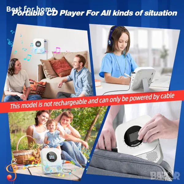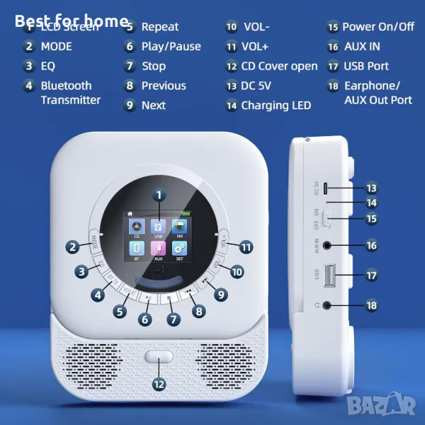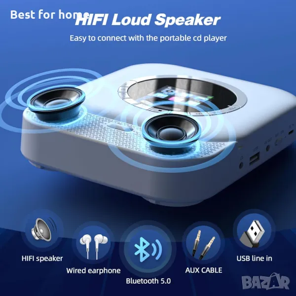Bluetooth приемник и предавател, преносим CD плейър с HiFi високоговорители, личен CD плейър с вграден LED дисплей, радио Поддръжка на CD плейър FM радио.