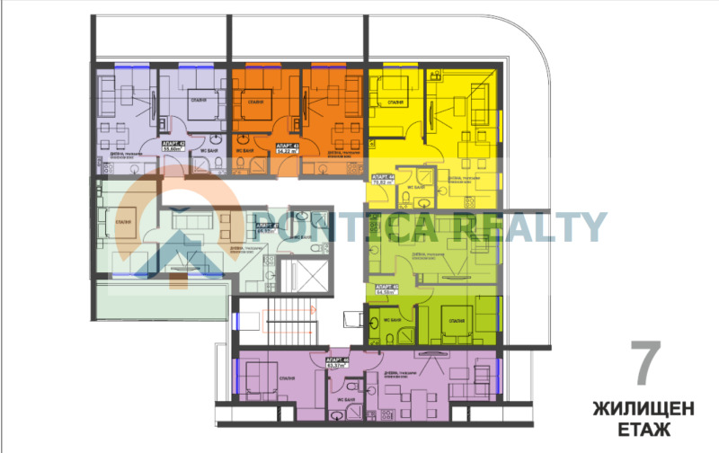 Имота се намира на седми, последен етаж с обща площ 54,22 кв.м.