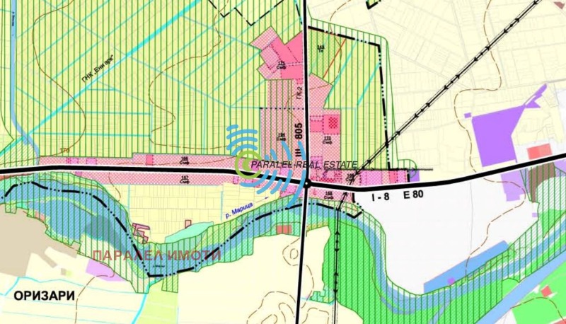 20071462 Парцел за промишлено строителство . Лице 80 м. на Околовръстното на гр. Пловдив ' Западна дъга ' и лице на второстепенен общински път. Района около терените е в процес на интензивна урбанизация. Наблизо се намират магазин ' Джъмбо ' и ' МЕТРО 2' .В близост до имота има изградена инженерна инфраструктура : Асфалтиран първокласен път с отбивка от републиканската пътна мрежа Е 805 , Трафопост, Сонда вода, Според ОУП на община ' Марица ' попада в зона ' Смф.' със следните устройствени показатели :
