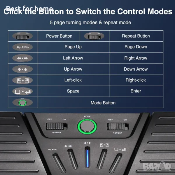 LEKATO Bluetooth педал за завъртане на страници, акумулаторен контролер за приложение с крачен превключвател за телефон, таблети, лаптоп, 5 режима, педал за свирене на инструменти или индикация.