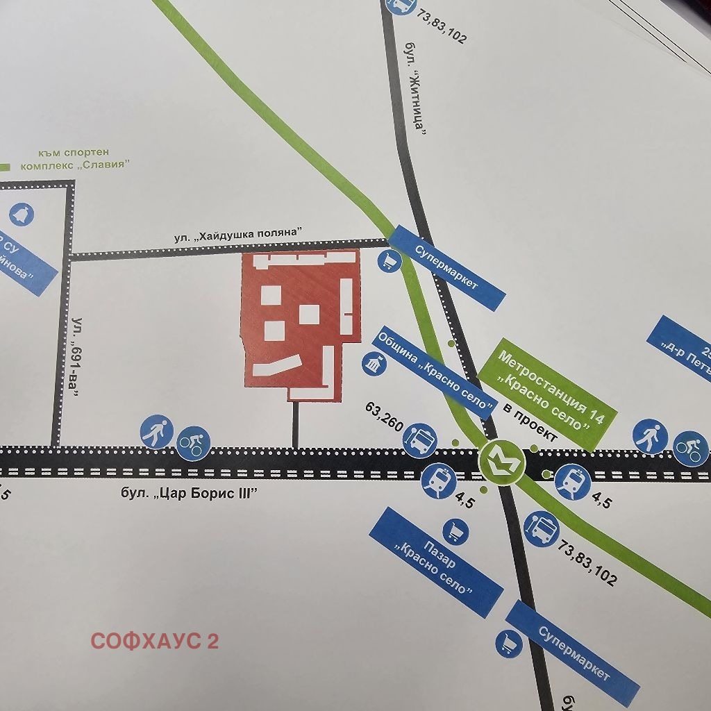 Комплексът е разположен на ключово място буквално на 100 метра от МЕТРО станция - в непосредствена близост до пазара Красно село , множество спирки на градски транспорт, община Красно село, бул. Цар Борис III и бул. Житница. Пазарът на Красно село е на няколко минути пешеходно разстояние. Модерният жилищен комплекс разполага с красиви озеленени общи части с луксозни арт ДИЗАЙНЕРСКИ градински мебели и алеи, зони за отдих и най- съвременни детски площадки. Междублоковото пространство е изцяло пешеходно . Сградите са с красиви разнообразни фасади в англииски стил, изградени с най - висок клас материали.ПРЕДИМСТВА НА ИМОТА: