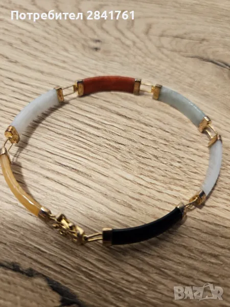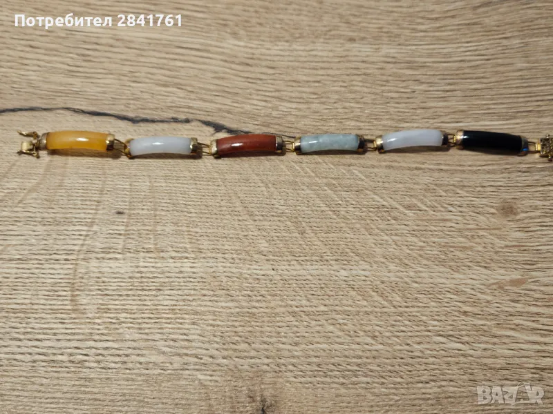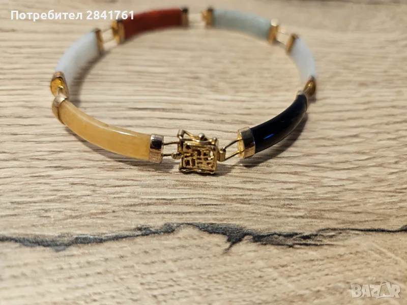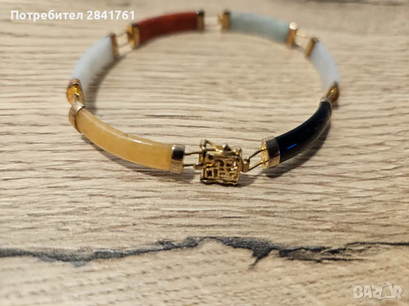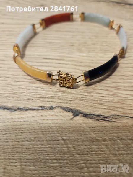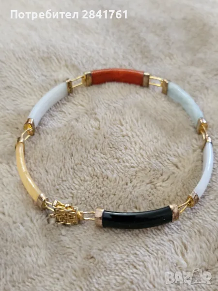 Антикварна сребърна китайска гривна за късмет благополучие с 6 панела с различни цвятове жадеит. С позлата, тегло 11.27 грама, дължина 20 см, за по-едра ръка