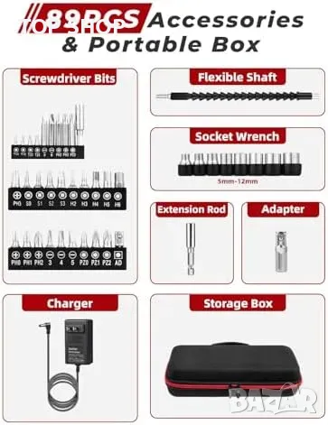 Комплект с 89 аксесоара – включва битове, удължител, адаптер, гъвкав вал и куфарче