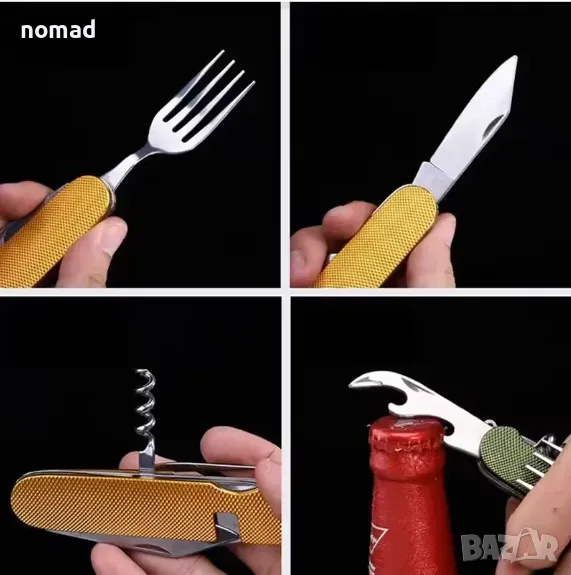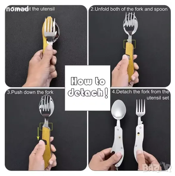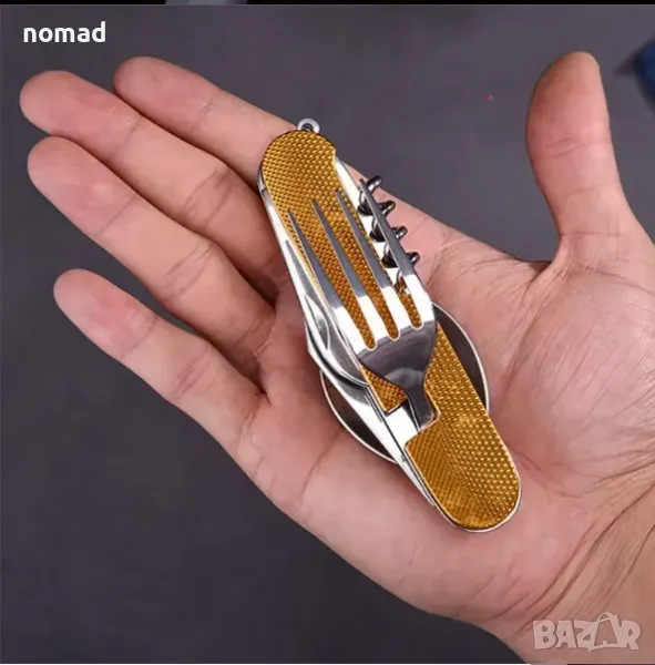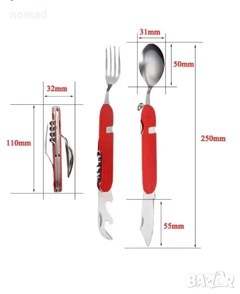 - 6 в 1 дизайн – нож, вилица, лъжица, отварачка за бутилки, инструмент за оцеляване