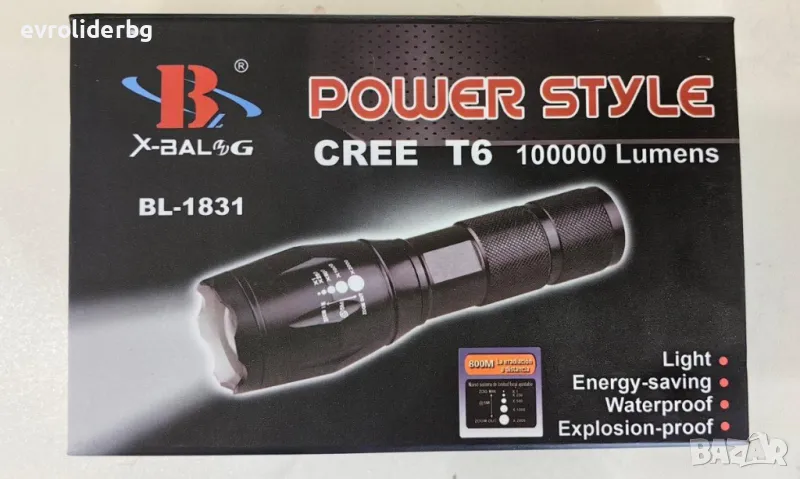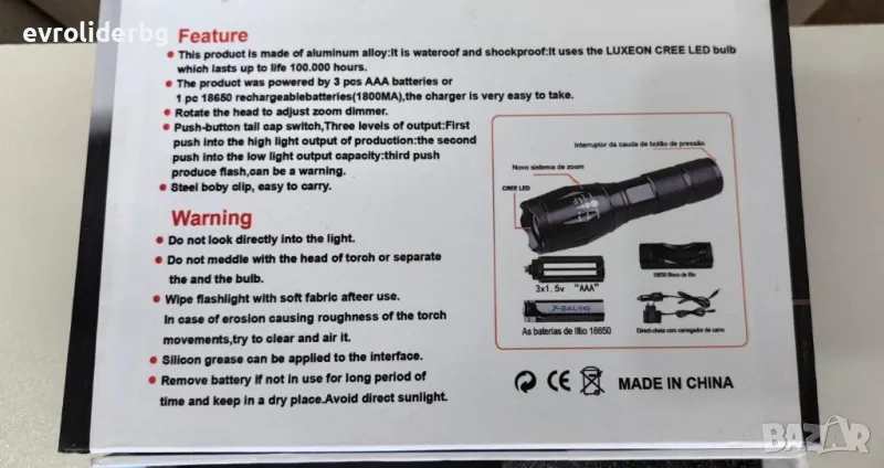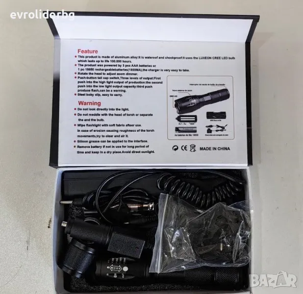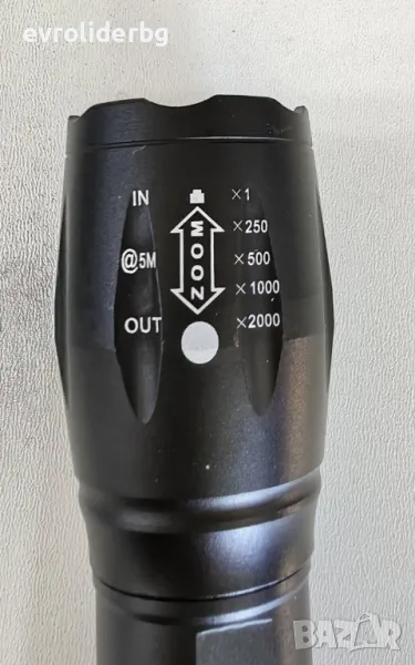 - Променлив фокус /ZOOM/ Захранване: 1 бр. акумулаторна батерия 3.7V тип 18650/8800 mAh. /включени в комплекта/