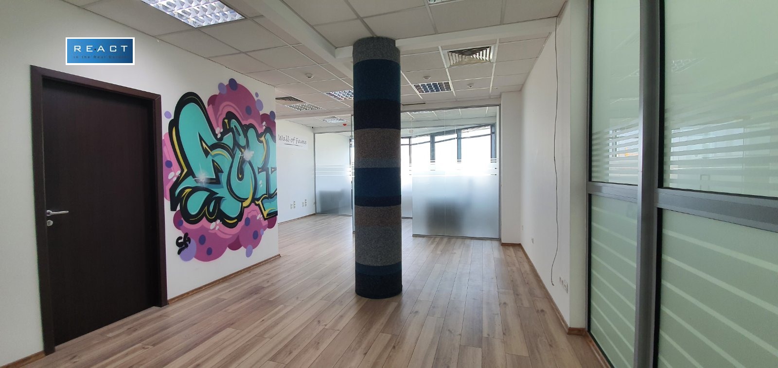Разпределение: 1 голямо Open space помещение, 2 самостоятелни работни помещения, малък склад, кухненски бокс, wc,тераса.