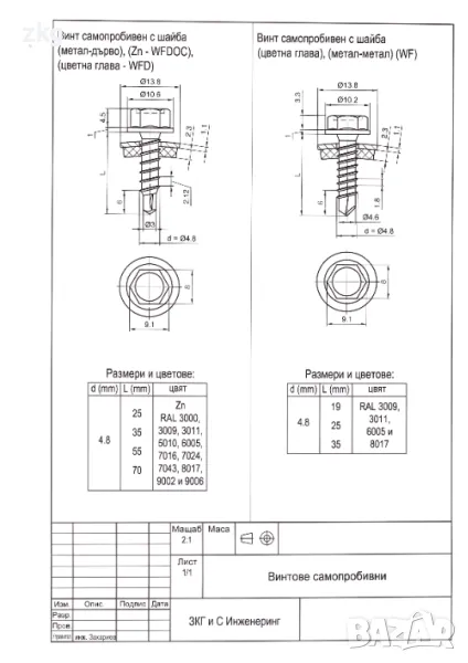 ламарини. Винтовете могат да бъдат с оцветени глави с цветове по RAL каталог или поцинковани, както за