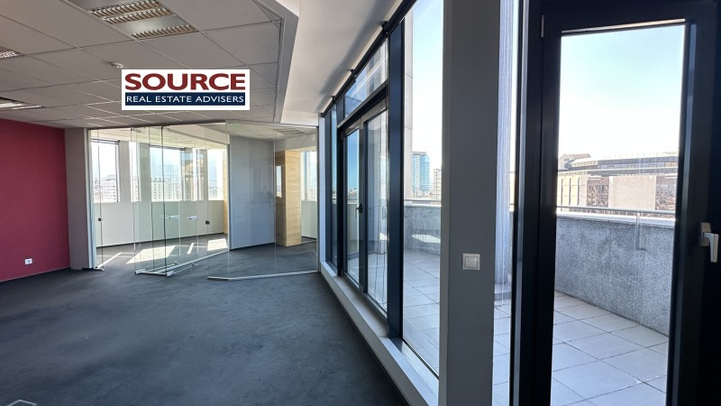 2. Разпределение: 1 голямо Open space помещение, 3 отделни работни помещения преградени със стъклени и гипсокартонени преградни стени, оборудвана кухня, 2 wc, 2 панорамни тераси. Офисът може да бъде изцяло с Open space разпределение или допълнително преграден според изискванията на Наемателя.