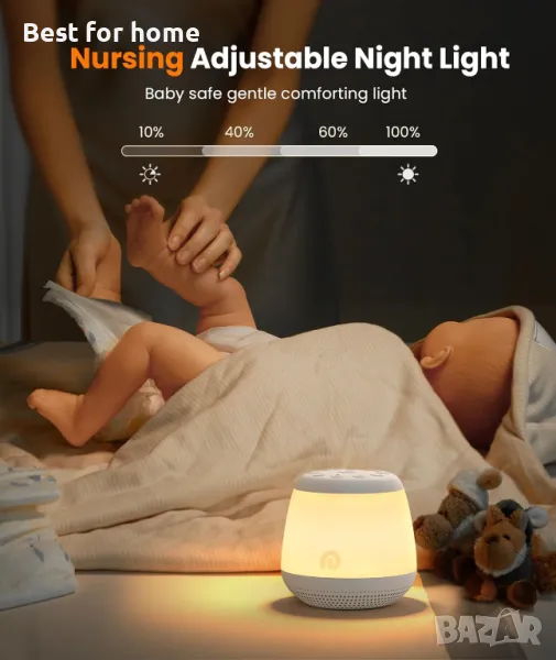 8 опции за нощна светлина: с 8 регулируеми цвята устройството D16Max за бял шум може да се използва и като нежна бебешка нощна лампа. Осигурява успокояваща светлина, която може да се регулира според вашите предпочитания или настроение. Независимо дали за детската стая или за релаксираща спалня, функцията за нощно осветление добавя успокояващо докосване към вашата стая.