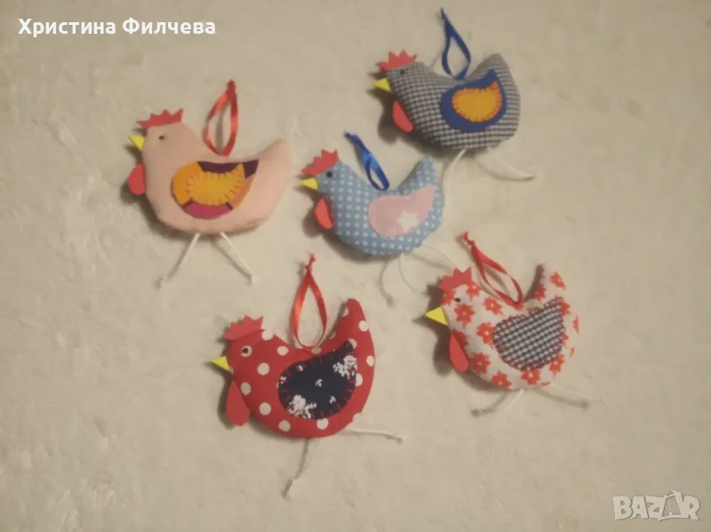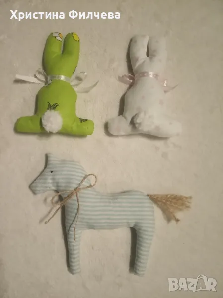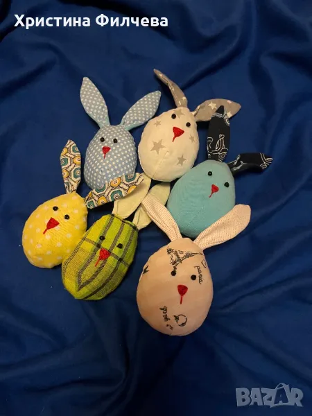 Весели зайчета, морковчета и яйчица, които са готови да украсят вашия празник. Изработени ръчно от памучни платове със силиконов пълнеж. Цената варира от 2 до 9 €