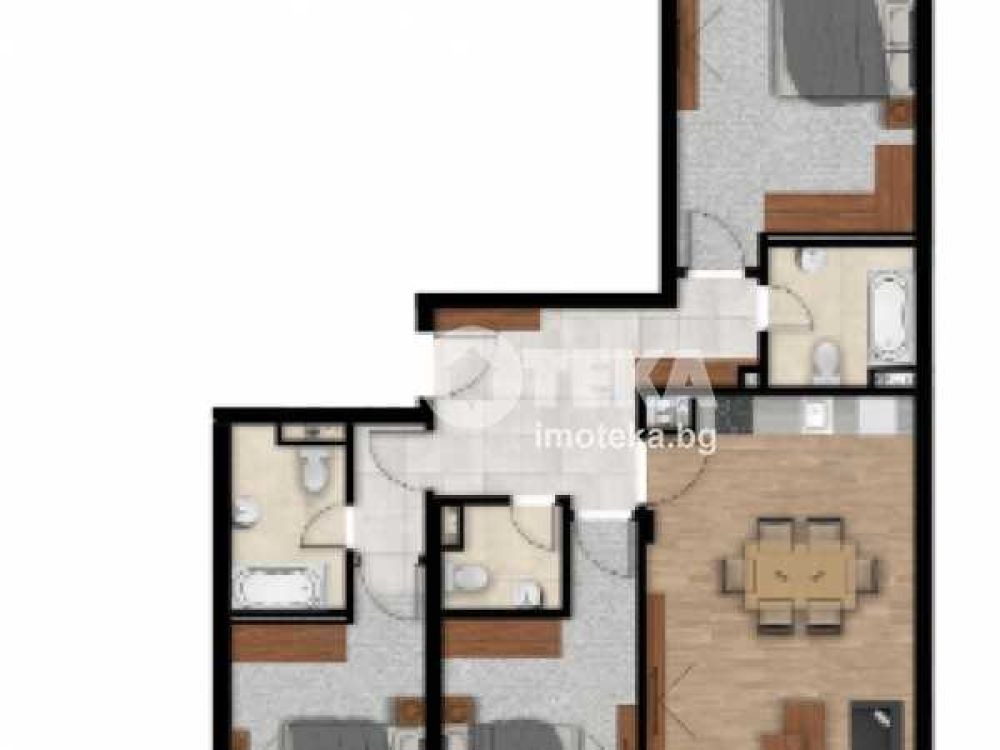 Многостаен апартамент състоящ се от дневна с кухненски бокс, три спални, две бани и две тераси с площ от 57 и 20 кв.м.
