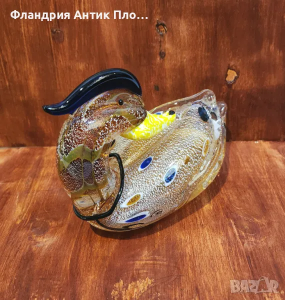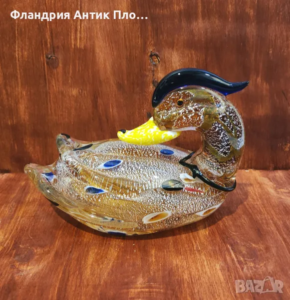 Впечатляваща декоративна фигура на патица, изработена от художествено стъкло с богата текстура и наситена палитра. Моделът представя патицата в седяща поза, с елегантно извита шия, ярко жълт клюн и ефектна тъмна корона. Тялото е украсено с нежни цветни вложки в синьо, златисто и бяло, които придават дълбочина и артистичен характер. Стъклото е прозрачно и блестящо, с фино „захарно“ покритие, което създава уникална повърхност. Подходяща за витрина, рафт или като централна част в колекция от стъклени животински фигури.
