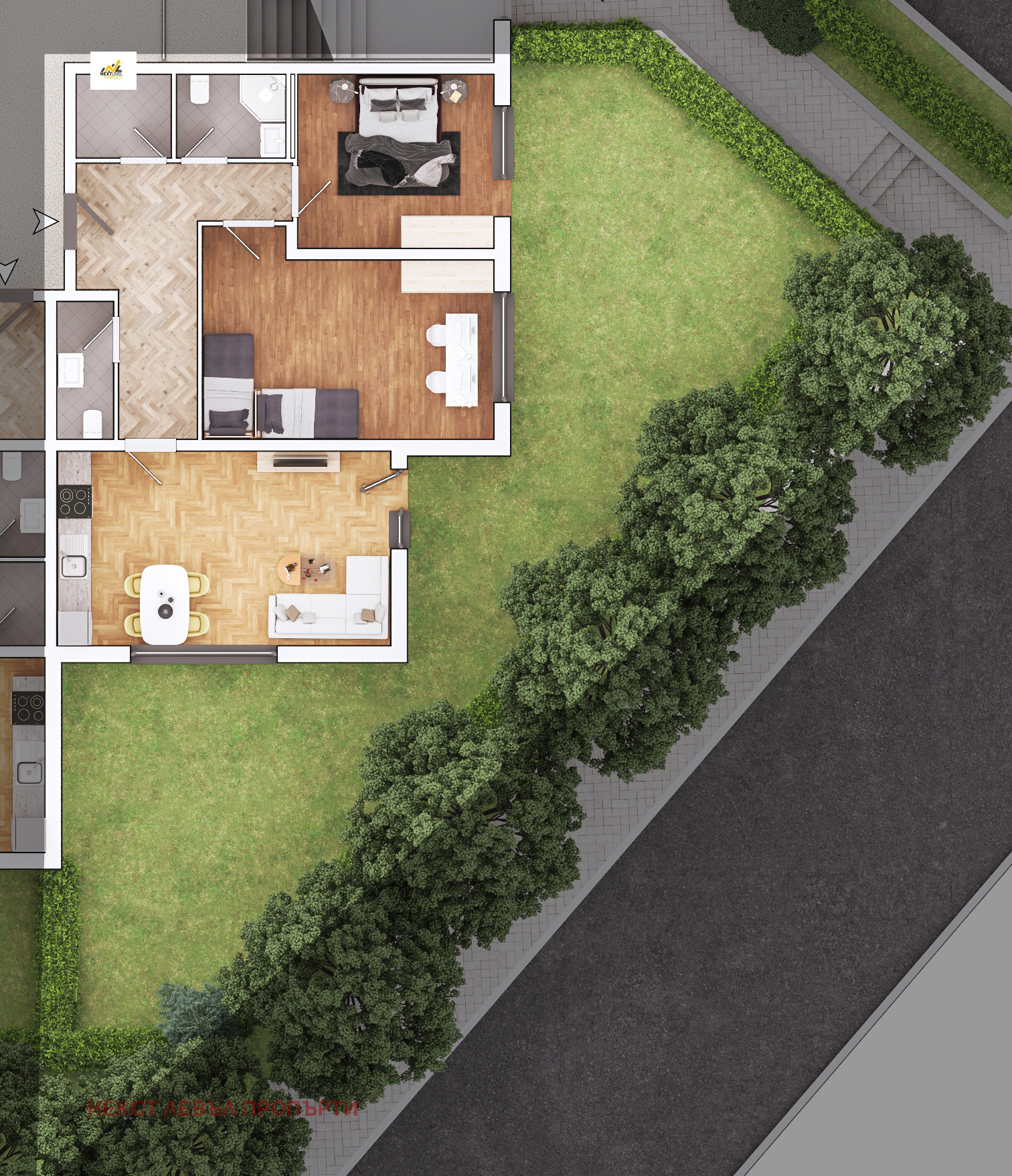 Агенция Некст Левъл Пропърти предлага на Вашето внимание тристаен апартамент от доказан строител в затворен комплекс със следното разпределение: коридор, кухненски бокс с трапезария, две спални, баня с тоалетна, тоалетна и склад/мокро помещение.