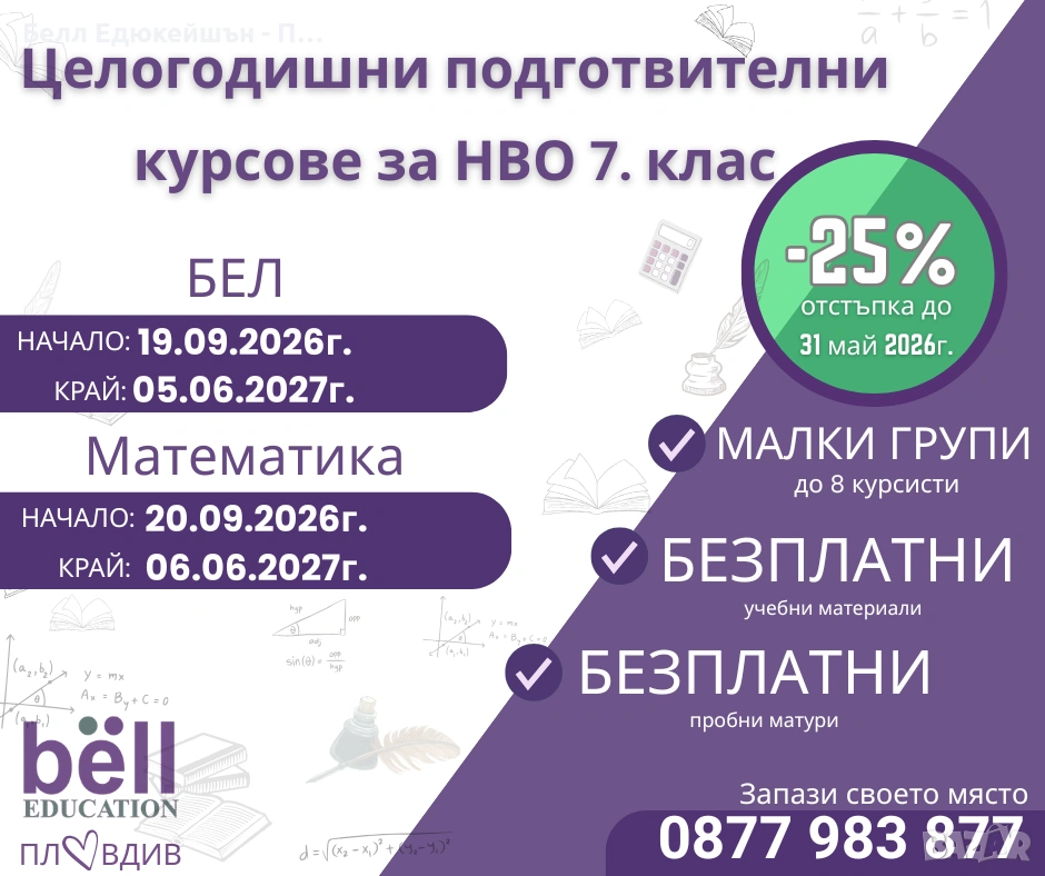 СУПЕР РАННИ ЗАПИСВАНИЯ за ЦЕЛОГОДИШНИ КУРСОВЕ за НВО 7-ми клас по БЕЛ И МАТЕМАТИКА за 2026/2027 година.