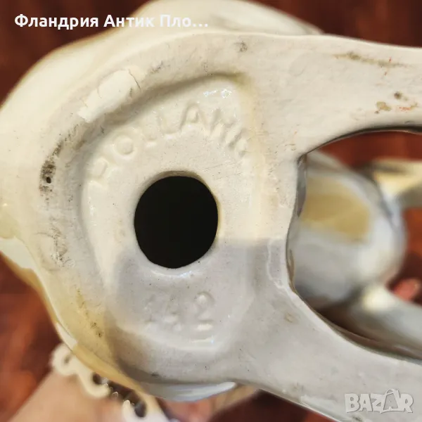 Изразителна порцеланова фигура, изобразяваща боксер в седяща поза с характерното за породата благородно излъчване и будно присъствие. Детайлите в муцуната, стойката и мускулатурата са прецизно моделирани, а глазурата е нанесена в топли бежово-кафяви тонове с плавни преливания. Фигурата носи релефен печат Holland с номер 142 отдолу – характерна маркировка за холандските керамични ателиета от средата на 20-ти век.