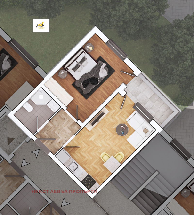 Агенция Некст Левъл Пропърти предлага на Вашето внимание двустаен апартамент от доказан строител в затворен комплекс със следното разпределение: антре, кухненски бокс с просторна трапезария, спалня, баня с тоалетна и тераса.