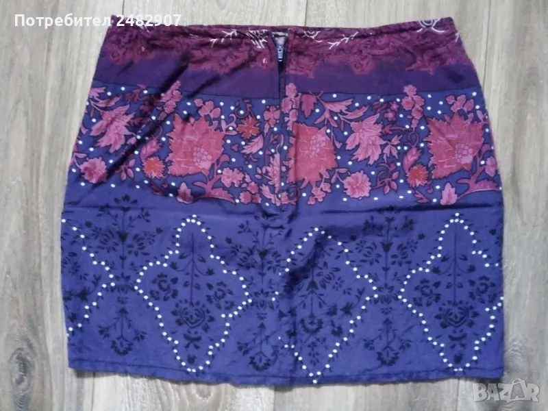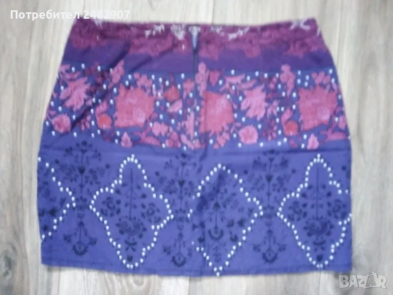 Къса дамска пола от тънък плат в лилаво, размер S. Ширина в талията - 36 см, ширина в долната част - 46 см, дължина от талията до долу - 38 см. Много запазена, почти не е използвана, закопчаване - с цип отзад.