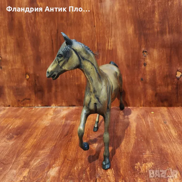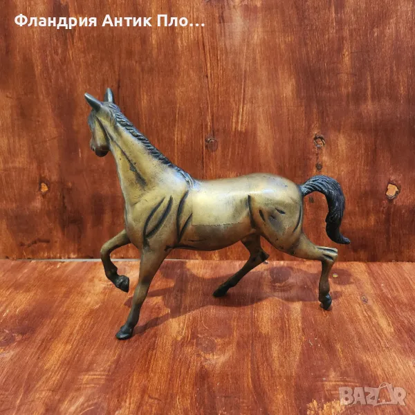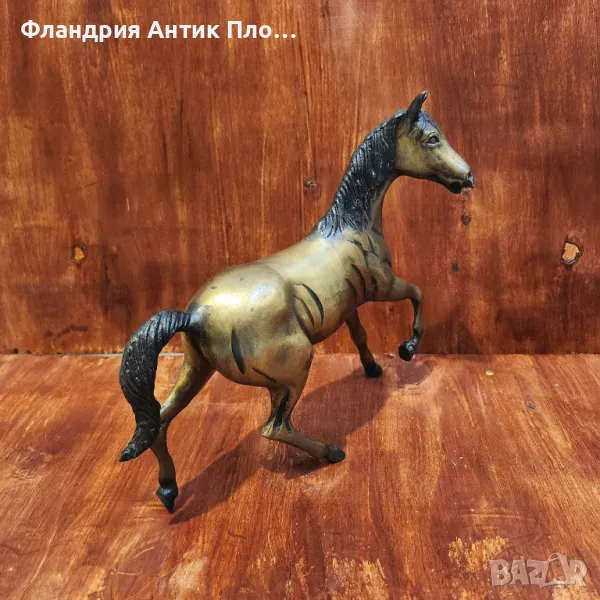 Елегантна бронзова скулптура, изобразяваща кон в движение. Фигурата е балансирана и пластично оформена, с подчертани мускули и естествено падаща грива. Патината в златисто-кафяви нюанси придава дълбочина и класически вид. Подходяща за интериор с класически или селски характер, както и като подарък за почитатели на конете.