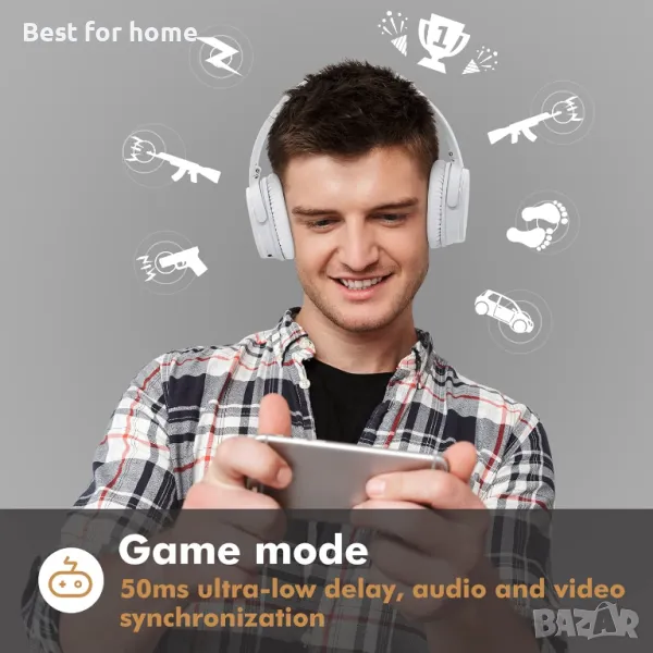 Режим с ниска латентност от 50 ms: Идеални Bluetooth слушалки за игри, гледане на телевизия и видео конференции, просто натиснете многофункционалния бутон три пъти, за да активирате режима с ниска латентност. Той значително подобрява чувствителността и стабилността на връзката, като същевременно се наслаждава на 50ms безсмислена латентност на възпроизвеждане