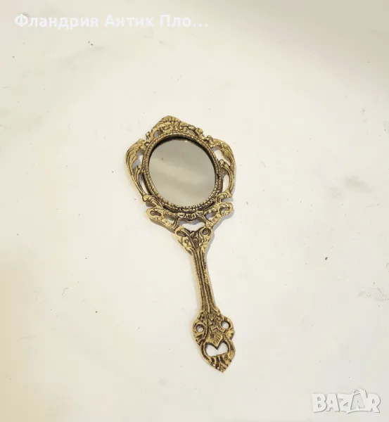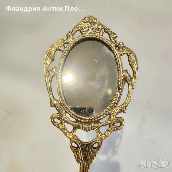 Компактно декоративно огледало с изящна метална рамка и богата орнаментика в стил винтидж. Дръжката и рамката са оформени с класически мотиви, напомнящи на барокова естетика. Изработено от масивен метал с леко състарен финиш, огледалото е подходящо както за практична употреба, така и като елегантен акцент върху тоалетка или в декорация на интериор с романтичен дух.