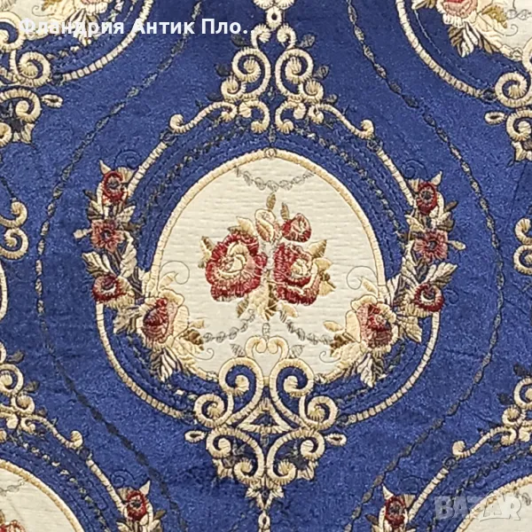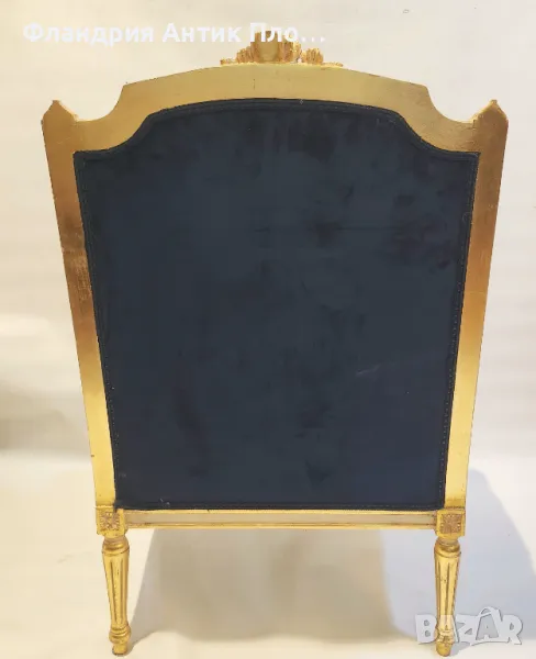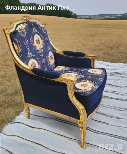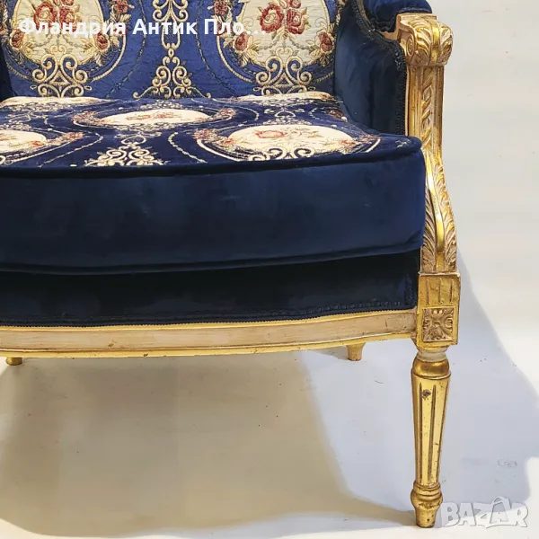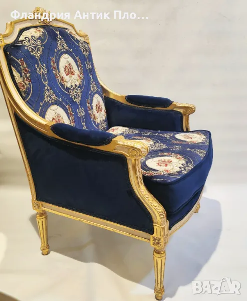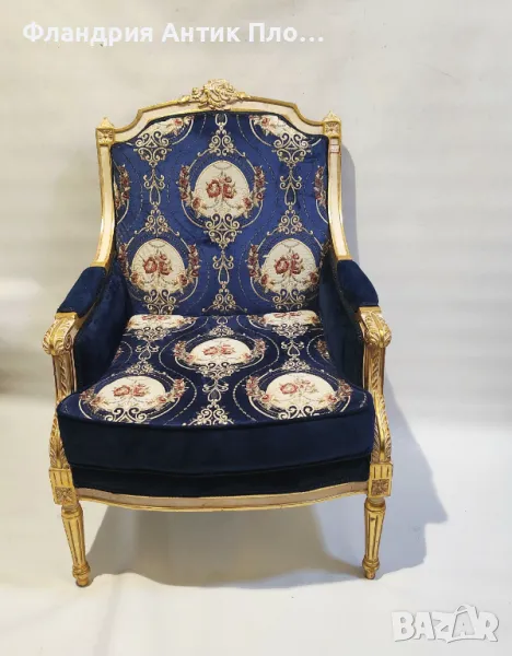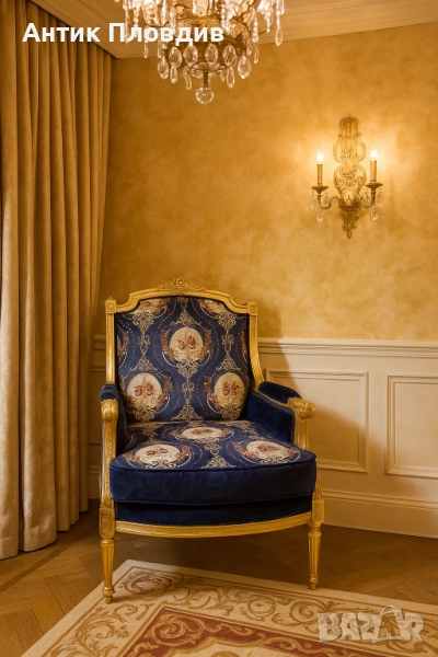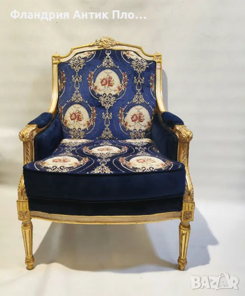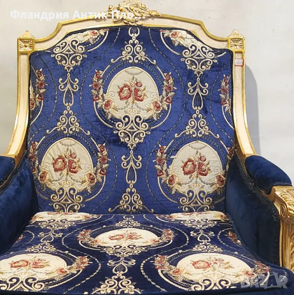 Изящно кресло в класически стил с позлатена дървена рамка и луксозна дамаска в кралскосиньо със стилизирани флорални медальони. Ръкохватките и краката са украсени с резбовани детайли, които придават изисканост и театрална елегантност. Меката седалка и високата облегалка осигуряват комфорт, а изработката е съвременна с акцент върху стил и устойчивост.