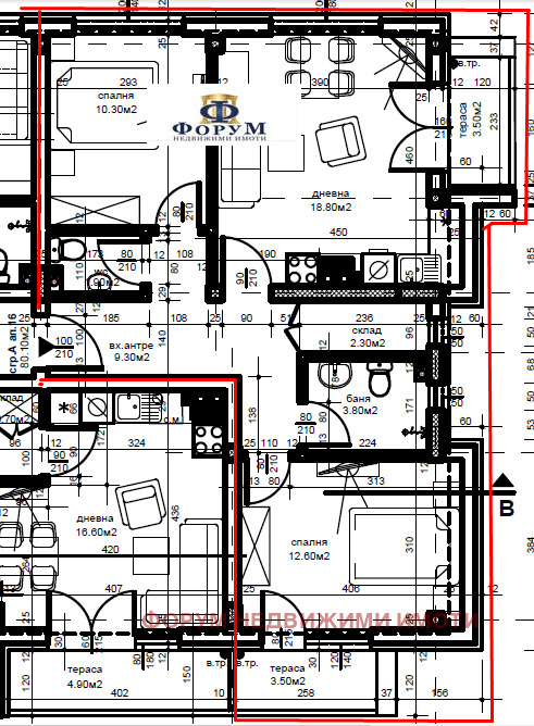 Представяме ви тристаен апартамент със застроена площ от 80,10 кв. м., състоящ се от антре, всекидневна с трапезария и кухненски кът, две спални, баня с тоалетна, втора тоалетна, склад, и две тераси. Находящ се на трети, непоследен етаж. Прилежаща изба с площ от 4,40 кв. м.