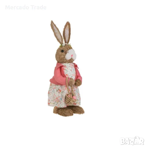 Великденско зайче Mercado Trade, декоративна фигурка на зайче от трева в естествен цвят с бяла рокля на цветя, розово сако и бели перли около врата. Тя държи малка кошница с розови яйца от пяна.