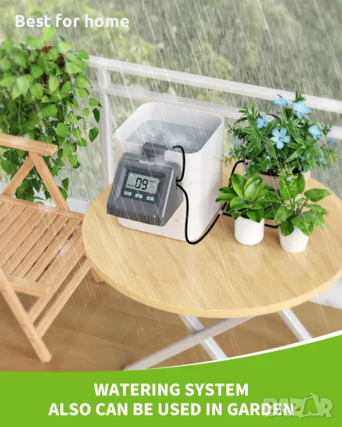 Компактен размер, но интелигентен - автоматичното поливане на растенията е преносимо, за да бъде окачено на всеки контейнер. Можете да използвате комплектите за автоматично капково напояване, за да изберете гъвкаво графика за поливане. Автоматичното напоително оборудване ще ви напомни за недостиг на вода по време на поливането.