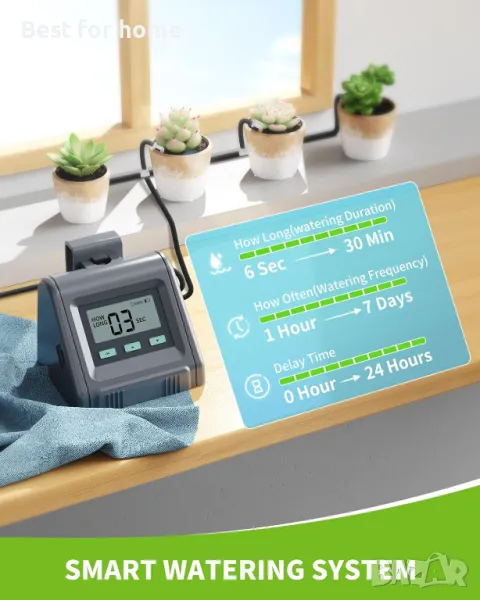 Автоматична система за поливане на саксийни растения - системата за поливане на стайни растения поддържа 10 саксии. Продължителност на поливането: 6s-30 min и честота на поливане: 1 ден-7 дни. Ако вали, можете да отложите графика за поливане с 1-24 часа. Освободете ръцете си за поливане на растения отсега нататък.