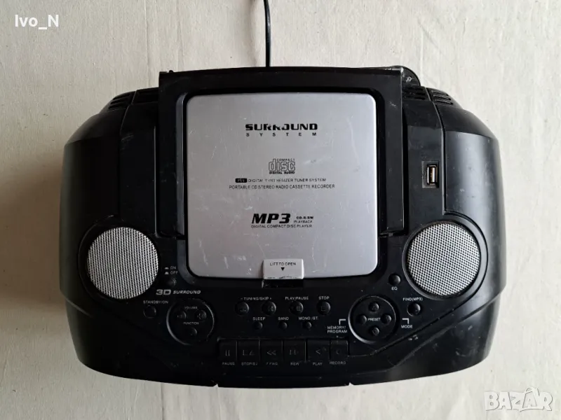 Устройството е в много добро външно и техническо състояние. Всичко работи, без касетофона. FM стерео тунер с автоматична настройка и памет на 20 станции, CD плеър също за MP3 компактдискове. USB порт. 3.5 мм аудио жак за слушалки.LCD дисплей. Четири еквалайзера. Ултра бас.Захранване 230v или 8 батерии R20. Включен захранващ кабел. Изпращам с Еконт с преглед и тест. Крайна цена.