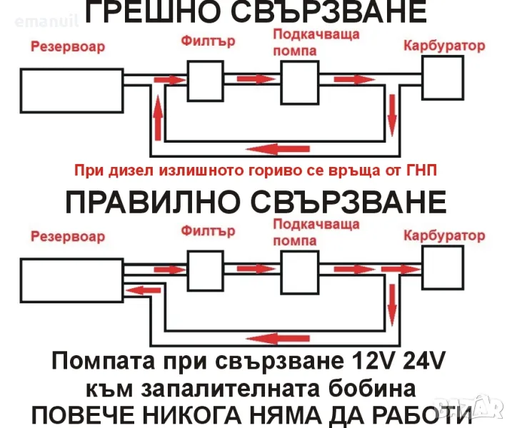 При вземане на захранване от запалителна бобина помпата никога повече няма да тръгне.