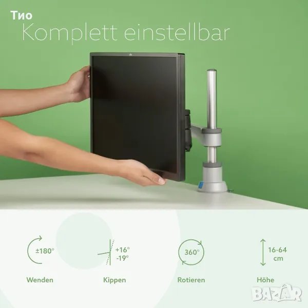 Висококачествена, масивна стойка с едно рамо и модулен дизайн, даващ възможност за поставяне на второ рамо - за втори монитор или за стойка за лаптоп/таблет.